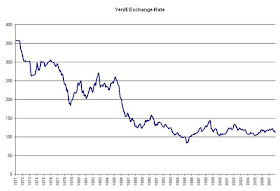 One more graph. If we just look at the FX between US dollar and Japanese Yen. The previous drop was even bigger: from 260 yen per dollar in 1985 to around 125 yen/$ in early 1989 (anyone remember Plaza Accord?), that's a stunning 55% drop (maybe I should use the word "collapse"). In fact, the Dollar against the Yen continued to fall until mid 1995, touching 90, and since then fluctuated in the 100 -150 range.